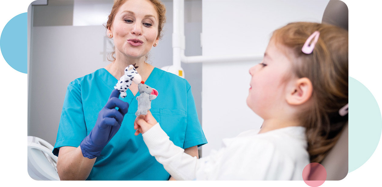 Dabei werden spielerisch der zahnärztliche Stuhl und Instrumente erkundet. Wir lassen den Stuhl per Zauber schweben, untersuchen gemeinsam die Zähne der Kuscheltiere und lassen den Mundstaubsauger den Durst stillen.